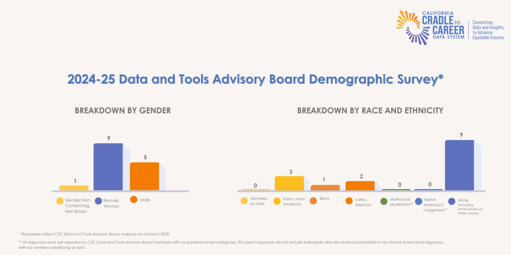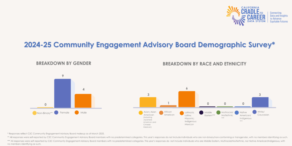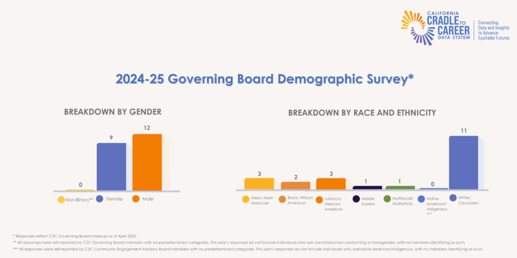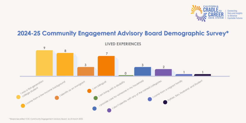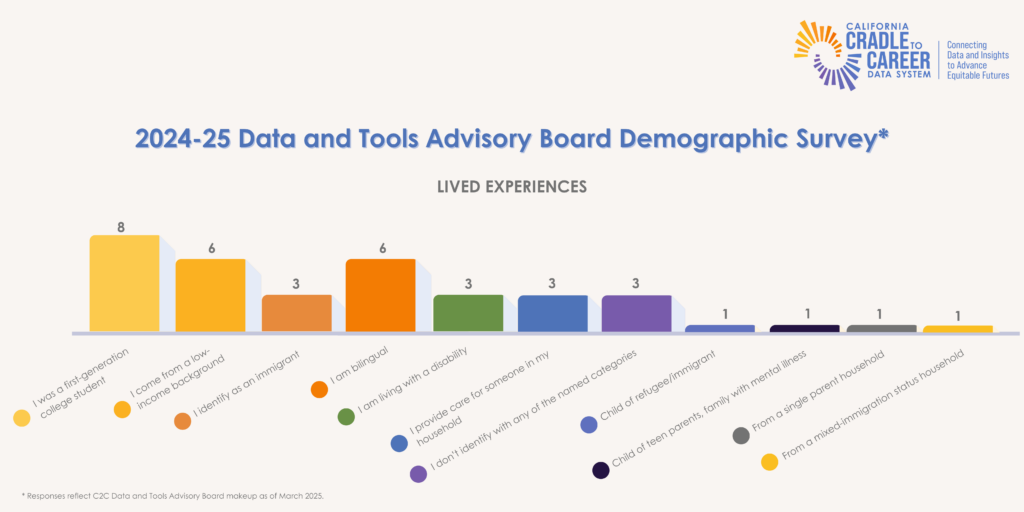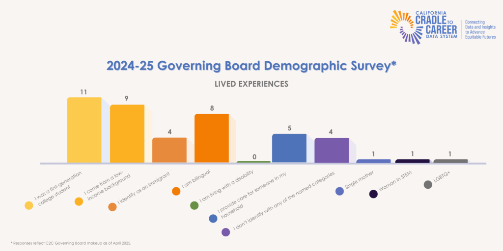 Members were asked to volunteer information about their lived experiences in 2025, as C2C’s boards represent the key stakeholders of the data system and the wide range of Californians that Cradle-to-Career is charged with serving.