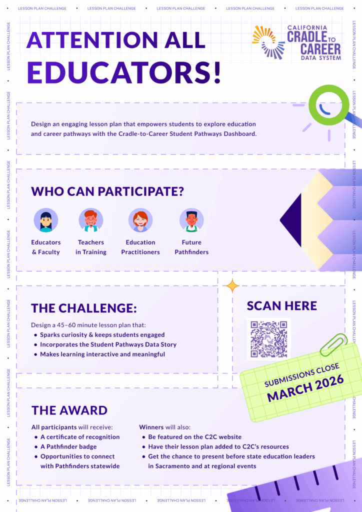 We’re inviting educators, aspiring educators, and post-secondary faculty to participate in creating an innovative lesson plan using the California Cradle-to-Career Data System Student Pathways Data Story to guide the next generation in making informed decisions.